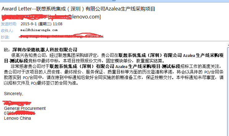 很高興告知貴公司,經(jīng)過聯(lián)想集團采購組評定,貴公司在聯(lián)想系統(tǒng)集成(深圳)有限公司Azalea生產(chǎn)線采購項目-測試標(biāo)段競標(biāo)中最終中標(biāo),本項目按照報價文件,固定模塊單價,數(shù)量據(jù)實結(jié)算。