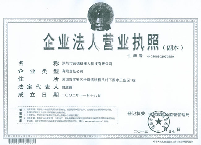 今天,全體榮德人見證了榮德發(fā)展歷史上重要的一刻:本公司由“深圳市榮德機械設(shè)備有限公司”正式更名為“深圳市榮德機器人科技有限公司”,注冊資本660萬元。