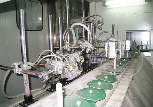 Ω靜電自動(dòng)噴涂設(shè)備,是將輸送軌彎曲成Ω形,工件圍繞圓盤式靜電噴槍周圍通過,并在噴涂過程中自轉(zhuǎn),圓盤噴槍上下移動(dòng)進(jìn)行自動(dòng)噴涂。由于工件圍繞圓盤噴槍通過,工件相對(duì)噴槍的時(shí)間較長,允許輸送鏈速度較高,故生產(chǎn)效率較高。圓盤噴槍上下移動(dòng)行程及速度,可依據(jù)工件外形來調(diào)節(jié),提高涂膜質(zhì)量。